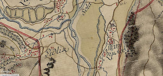 Postanowiłem przeprowadzić swoje prywatne śledztwo w celu ustalenia rzeczywistego stanu rzeczy. Sama kaplica nierozerwalnie związana jest z osadą Stary Żywiec, a więc z historycznego punktu widzenia protoplasty obecnego miasta Żywiec. Poniżej screen z austriackiej mapy wojskowej (1763-1787) przedstawiającej Stary Żywiec. Warto zwrócić uwagę, że układ dróg w obrębie osady oraz głównej drogi "na Suchą" wiodącej na wschód od Starego Żywca nie uległ właściwie zmianie aż do wysiedlenia wsi pod koniec lat 60 tych XX w.